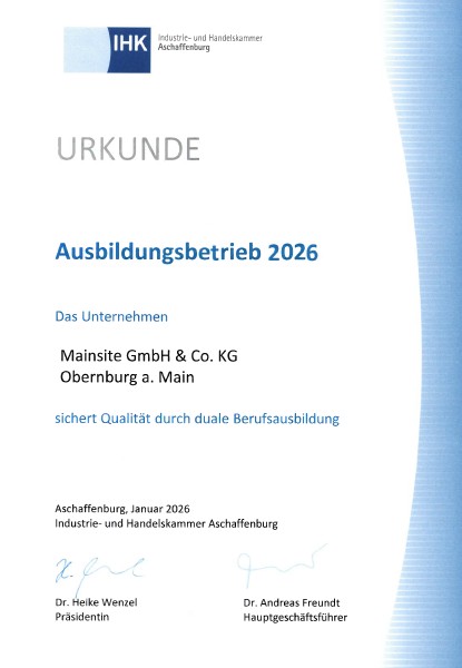 Von der IHK Aschaffenburg sind die Mainsite-Ausbildungseinrichtungen seit Jahrzehnten als "Anerkannter Ausbildungsbetrieb" ausgezeichnet.