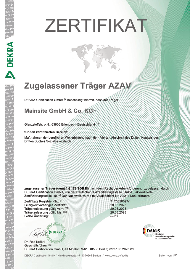 Im Jahr 2023 erhielt Mainsite die Trägerzulassung nach AZAV (Akkreditierungs- und Zulassungsverordnung Arbeitsförderung). Die Trägerzulassung ist ein Qualitätsnachweis für< Bildungsträger, um Maßnahmen der Arbeitsförderung (SGB III) anbieten zu können. Sie ist auch Voraussetzung für die Zusammenarbeit mit der Bundesagentur für Arbeit und deren Finanzierung durch Bildungsgutscheine.