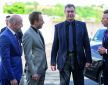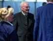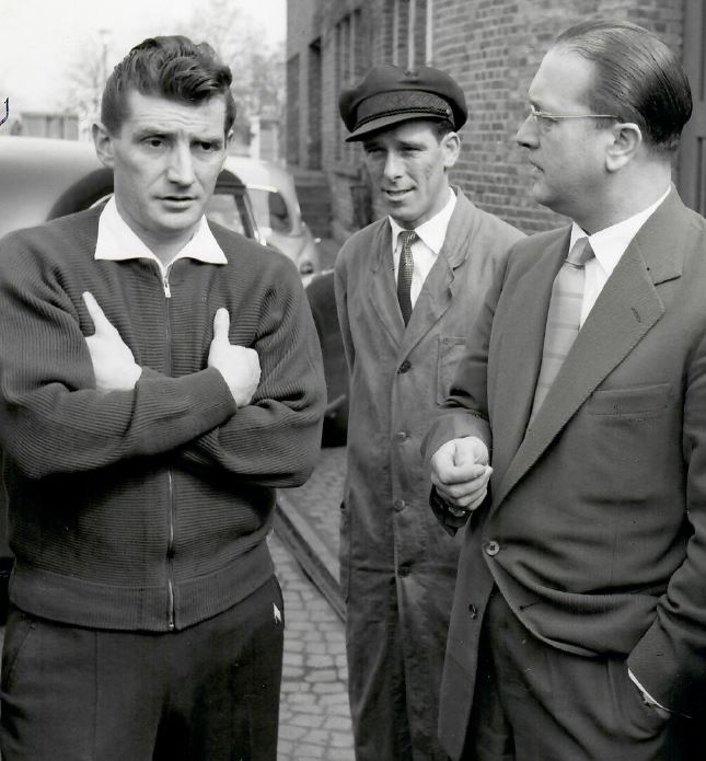 Foto rechts: Fritz Walter (links), Kapitän der WM-Elf von 1954, bei einer Standortbesichtigung seines Heimatvereins, des 1. FC Kaiserslautern, im Gespräch mit Mitarbeitern.