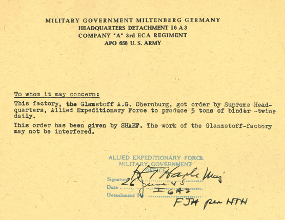 Doch schon am 26. Juni 1945 erteilt die amerikanische Militärregierung die Erlaubnis zur Produktion von täglich fünf Tonnen "Erntebindegarn". Trotz immenser Versorgungsschwierigkeiten bei Rohstoffen und Energie startet die Produktion wieder kurz vor Weihnachten 1945 - wenn auch nur in kleinem Maßstab.