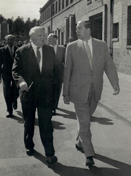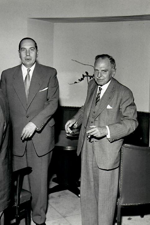 Foto links: Bundeswirtschaftsminister Ludwig Erhard (links, mit Zigarre) und Vorstandsvorsitzender der Glanzstoff AG, Dr. Ernst-Helmut Vits, anlässlich einer internationalen Wirtschaftstagung in Obernburg 1956.