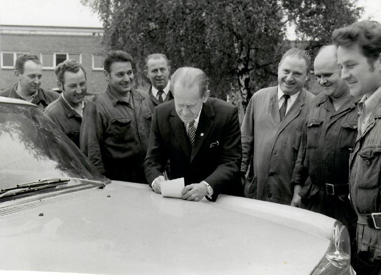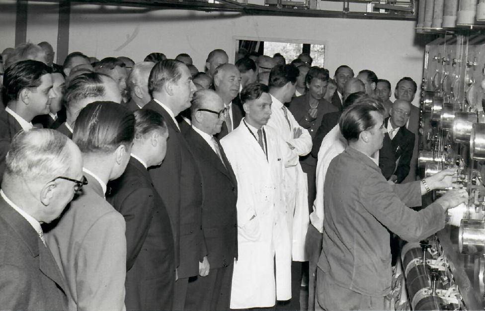 Foto links: Standortmitarbeiter umringen 1959 Sepp Herberger (Mitte), Bundestrainer der legendären Fußballweltmeisterschafts-Elf von 1954 beim "Wunder von Bern" bei einer Autogrammstunde im Werk.