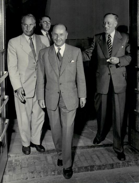 Foto links: Der Bayerische Ministerpräsident Dr. Hanns Seidel (Mitte) mit Glanzstoff-Vorstand Dr. Alfred Ebert (rechts) und Werkleiter Senator Dr. Walter Gammert (links) 1956 beim Besuch in Obernburg.