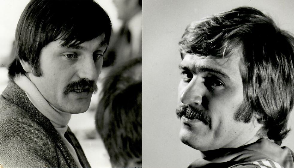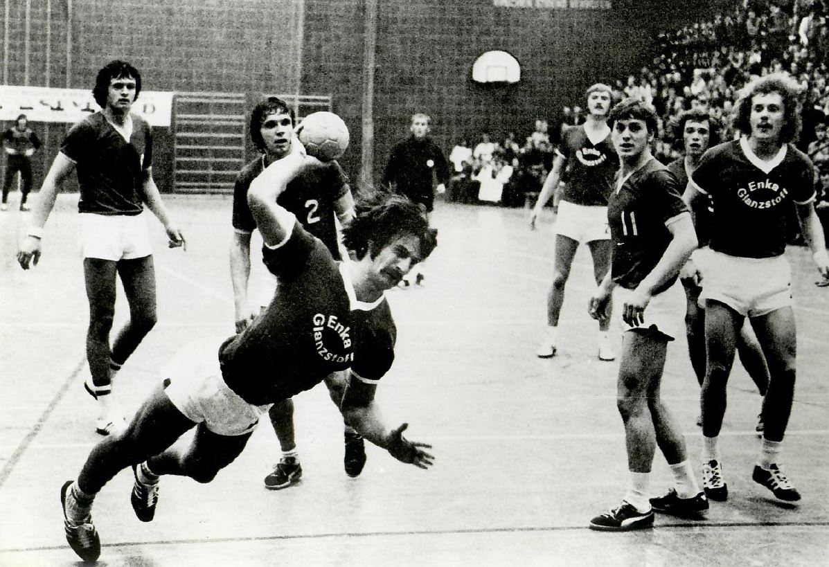 Foto links: Zwei Stars des TV Großwallstadt: Kurt Klühspies und Manfred Hofmann. Foto rechts: Voller Einsatz beim Spiel des TVG - mit Trikots von ENKA.