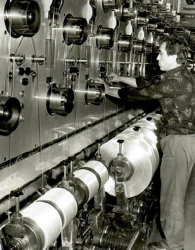 Am 19. März 1924 ist es so weit: erstmals wird auf einer Obernburger Maschine ein textiler Viscosefaden gesponnen. Zu diesem Zeitpunkt zählt das Werk 272 Beschäftigte. Im Folgejahr sind es bereits 2.000.