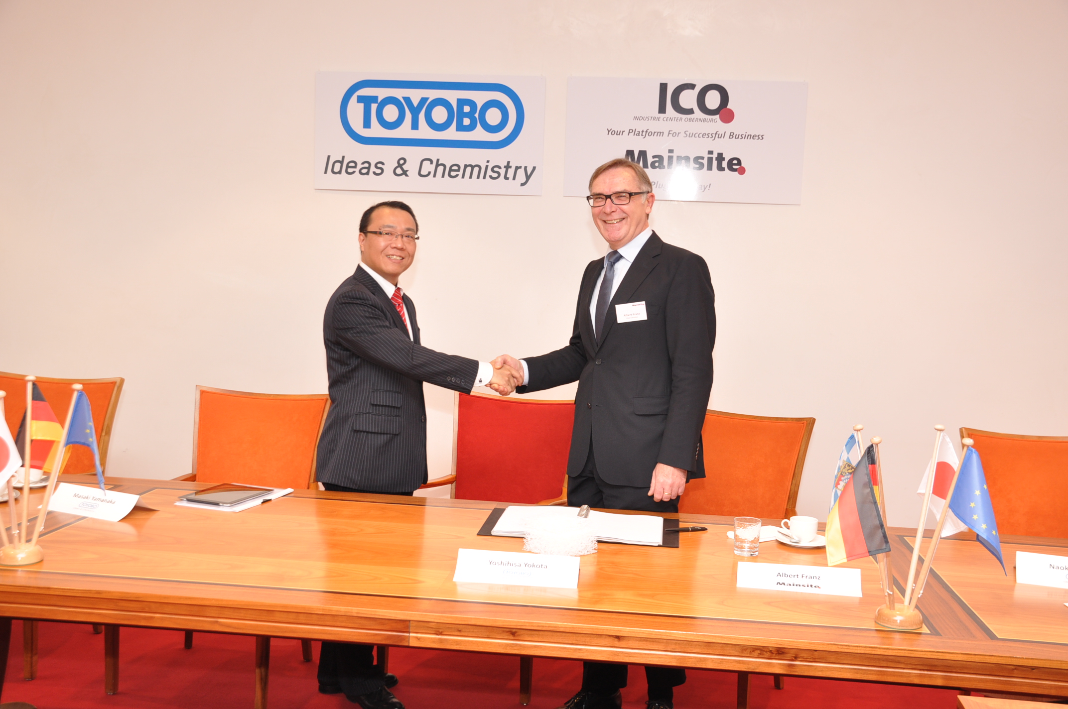 Foto links: Feierliche Unterzeichnung des Ansiedlungsvertrags im ICO zwischen der Mainsite und dem japanischen Unternehmen Toyobo, einem Hersteller innovativer luftdurchlässiger Matten für Polster, Matratzen und zahlreiche weitere Anwendungen. Toyobo ist das erste japanische Unternehmen, das sich im Landkreis ansiedelt.