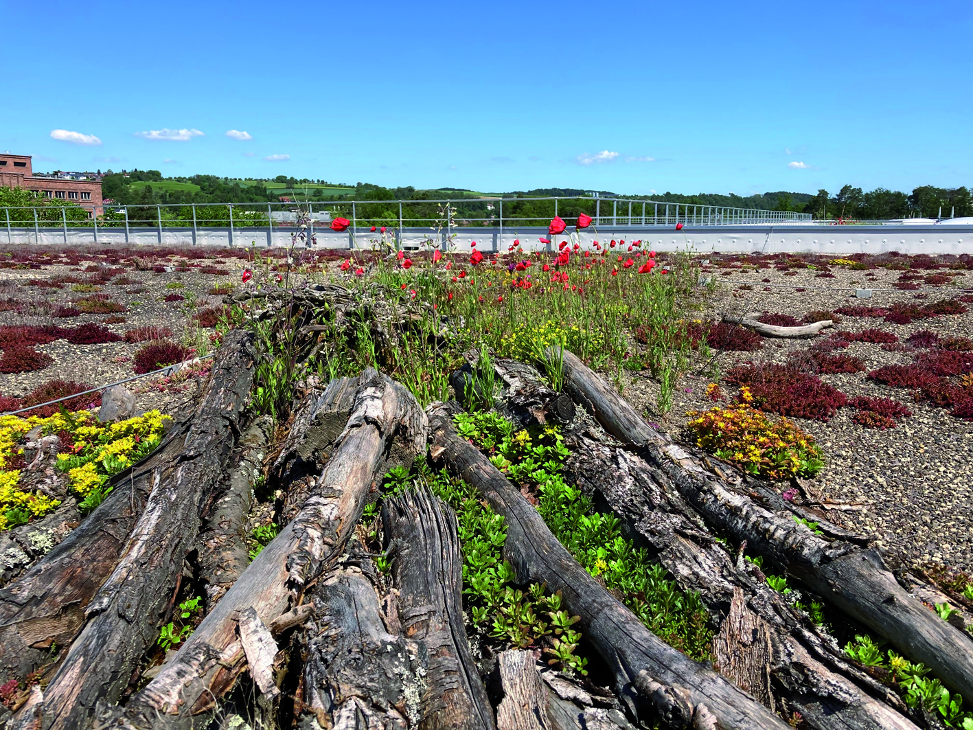 Auf dem Gründach finden Fauna und Flora des überbauten Areals mit zahlreichen Totholzstapeln und Wassertümpeln eine neue Heimat.