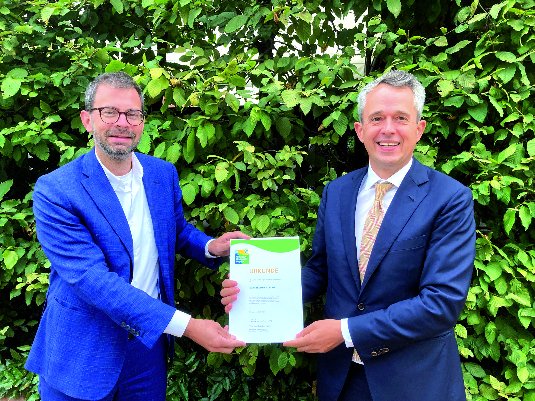 Mehr Umweltschutz und Nachhaltigkeit: im Jahr 2021 tritt die Mainsite dem "Umweltpakt Bayern" bei. Von Landrat Jens-Marco Scherf (links) erhält Mainsite-Geschäftsführer Dr. Johannes Huber die Urkunde überreicht.