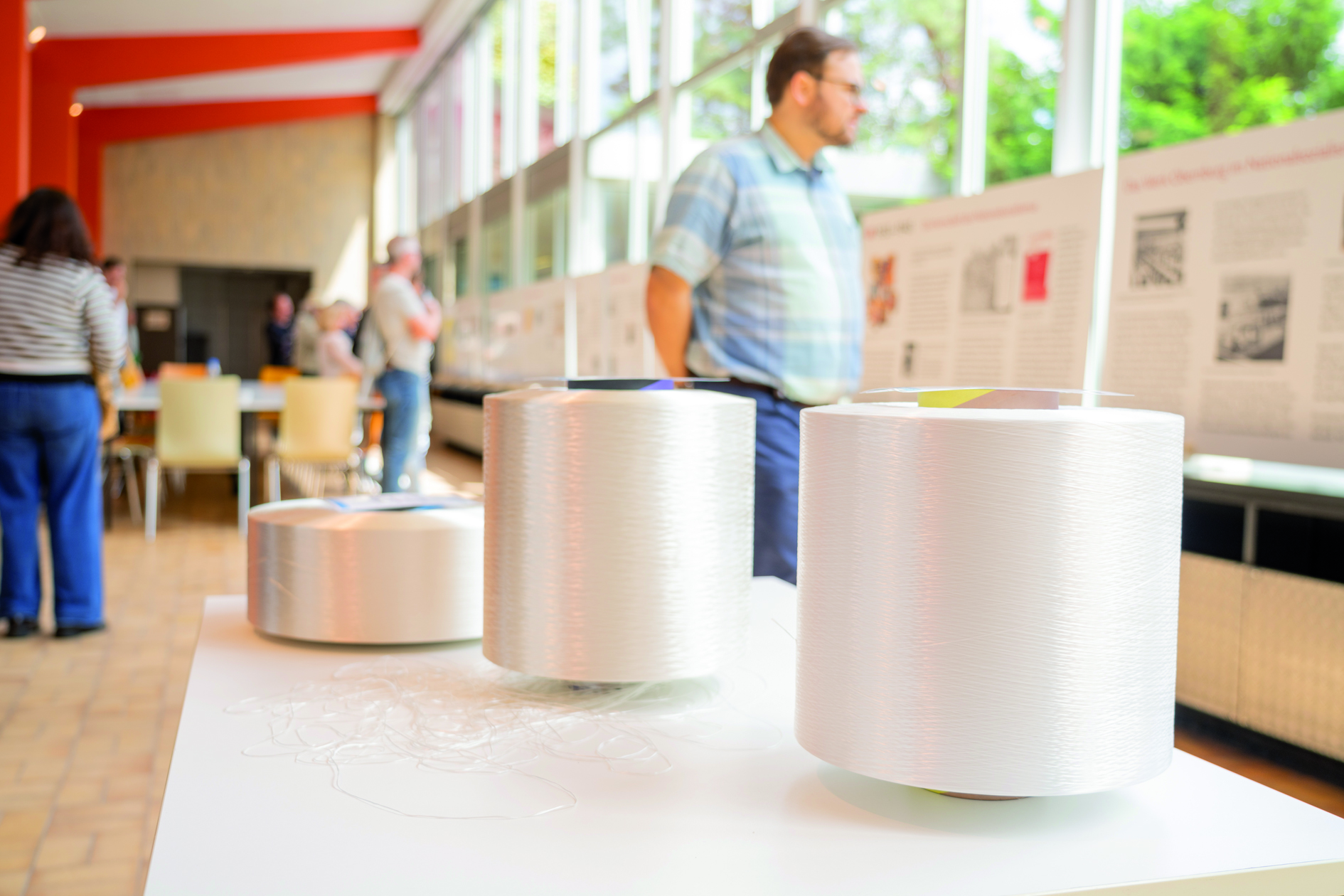 Auf Versuchsanlagen werden verschiedenste neue Produkte getestet und bis zur Produktionsreife weiterentwickelt, darunter auch elastische Garne oder Xylee, ein synthetisches Schaftmaterial für Schuhe.
